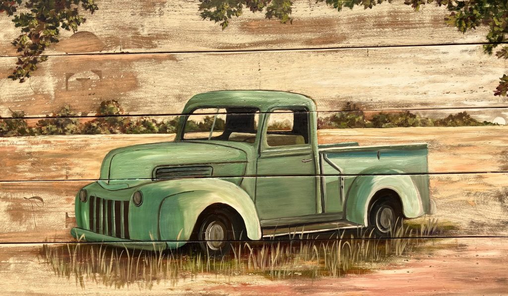The theme of his show, “Red Dirt Roots,” is based on the simple agricultural environments seen in our rural communities. Abandoned houses, buildings, barns, and livestock are reminders of the way of life in our state. Viewers may notice that many works are created on reclaimed signage and wooden boards that look like scrap materials easily found on a farm. “Many of our recent ancestors were resourceful and grew up with a mentality to reuse and repurpose. I wish our society could cut back on mass consumerism and the disposable nature of almost everything. Hopefully, my pieces will give a nod to the former mentality, and others will see beauty in the simple, rustic presentation of my work.” Arlyn‘s work will be on display at the Heritage Center Museum in April and May. He also helped the museum create a new feature exhibit titled Jesse Chisholm, where you may view his Mural Work and rendering of an old Homestead.